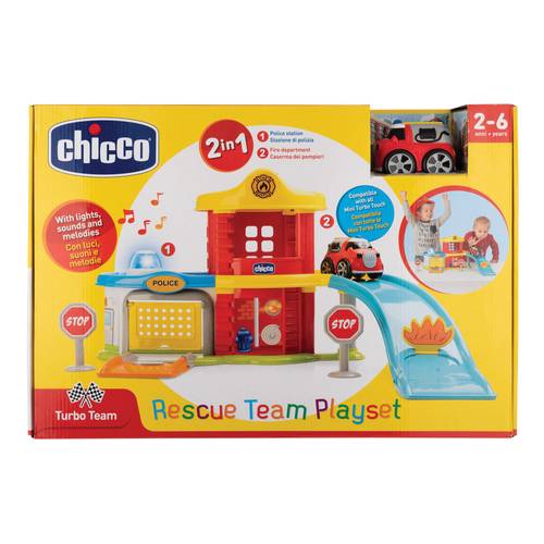 Con police-fire station playset di chicco il bambino si divertià a giocare con il camion dei pompieri e la stazione di polizia. Un quartiere generale a più piani, dove iniziano tutte le avventure e le missioni della squadra di polizia e dei vigili del fuoco. Il bambino ha due aree diverse con cui giocare: un'area, che i vigili del fuoco possono utilizzare per fornire un aiuto immediato quando scoppia un incendio in città e un garage dove possono riposare fino a quando la sirena elettronica squilla nuovamente per una nuova chiamata di soccorso.