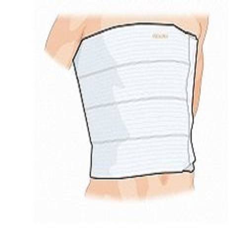 Contenzione antalgica. Costituita da fasce di tessuto elastico che permettono un’intensità di tensione adatta alla morfologia della cassa toracica. L’unione delle fasce è ottenuta per mezzo di cuciture che consentono la traspirazione della pelle. La parte interna è in tessuto morbido per un migliore comfort.